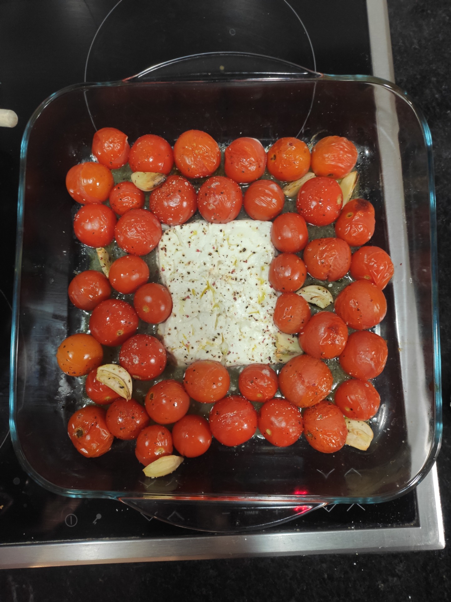 Comece por colocar o seu bloco de queijo feta no centro da travessa. Rodeie com os tomates cherry inteiros e com as metades dos dentes de alho. Tempere tudo generosamente com azeite, sal e pimenta ralada.